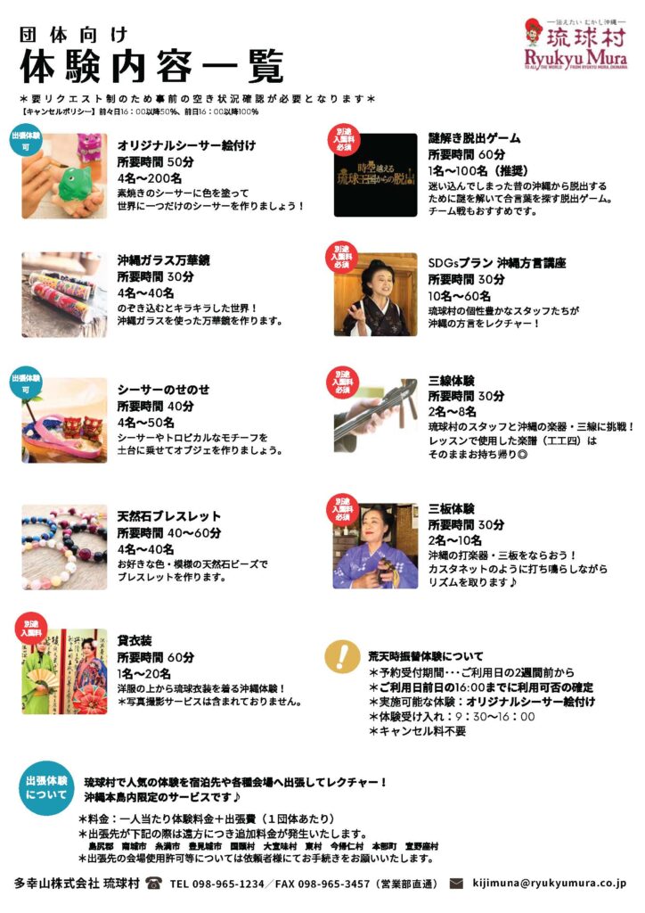 修学旅行・一般団体向け体験内容一覧